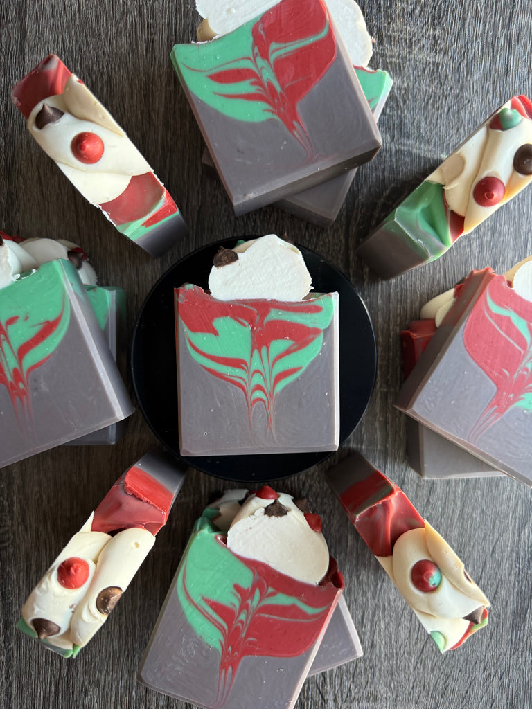 Peppermint Cocoa scream Holiday smelling of rich chocolate with cooling mint, crushed peppermint, fresh mint leaves, dark and white chocolate & cocoa nibs. Confectionary sugar and vanilla bean deliver a sweet, refreshing finish. YUM!